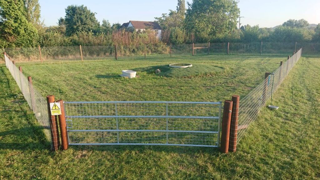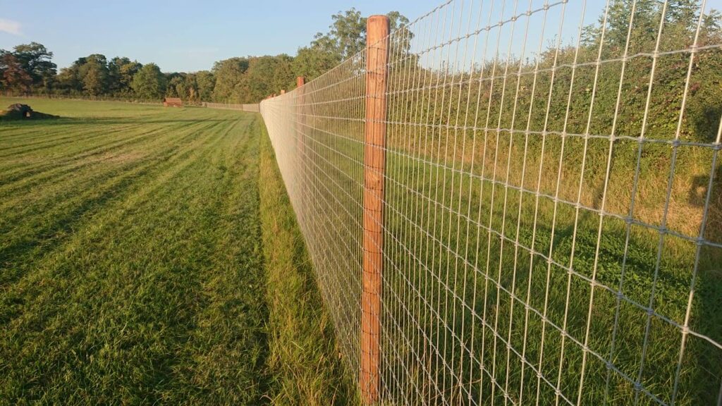 The fence is 6ft tall and made from galvanised high tensile tornado wire. The gaps are 5cm x 10 cms. The fence is flush to the ground and away from hedges to prevent damage.