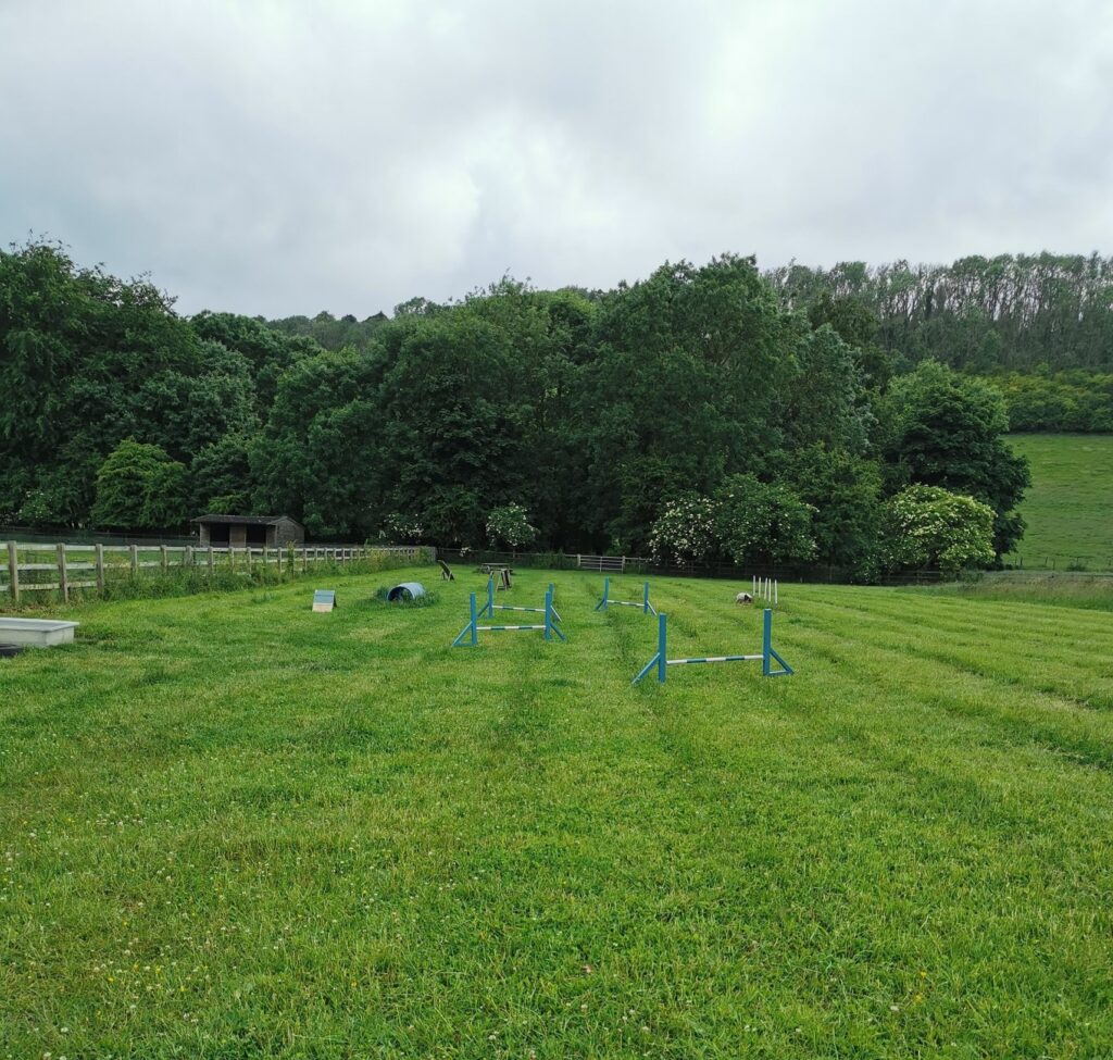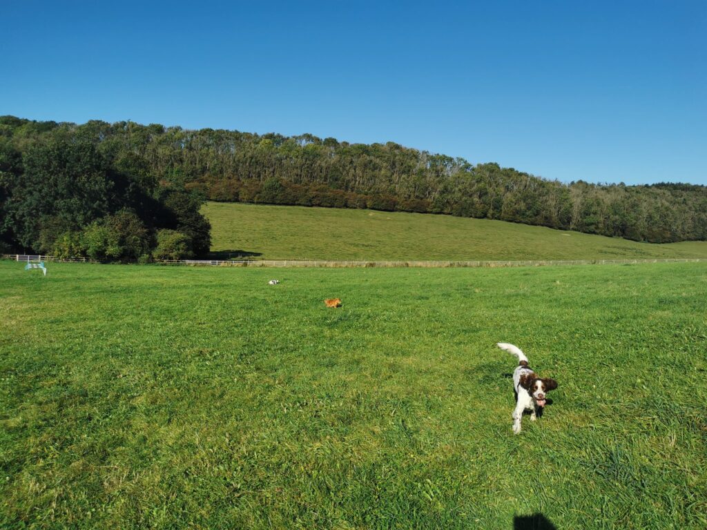 Fully enclosed 5 acre field available for hourly rental for dog walking, in a beautiful location in Woldingham. Suitable for dogs that aren’t inclined to jump a 4ft fence. 4ft high wire mesh all around so they can’t go under or through. Ideal for recall training or if your dog is scared of others and needs to be walked in a private area. We provide seating, fresh water, agility equipment and a bin. £10.00 per hour for up to 5 dogs. Viewing required before booking.