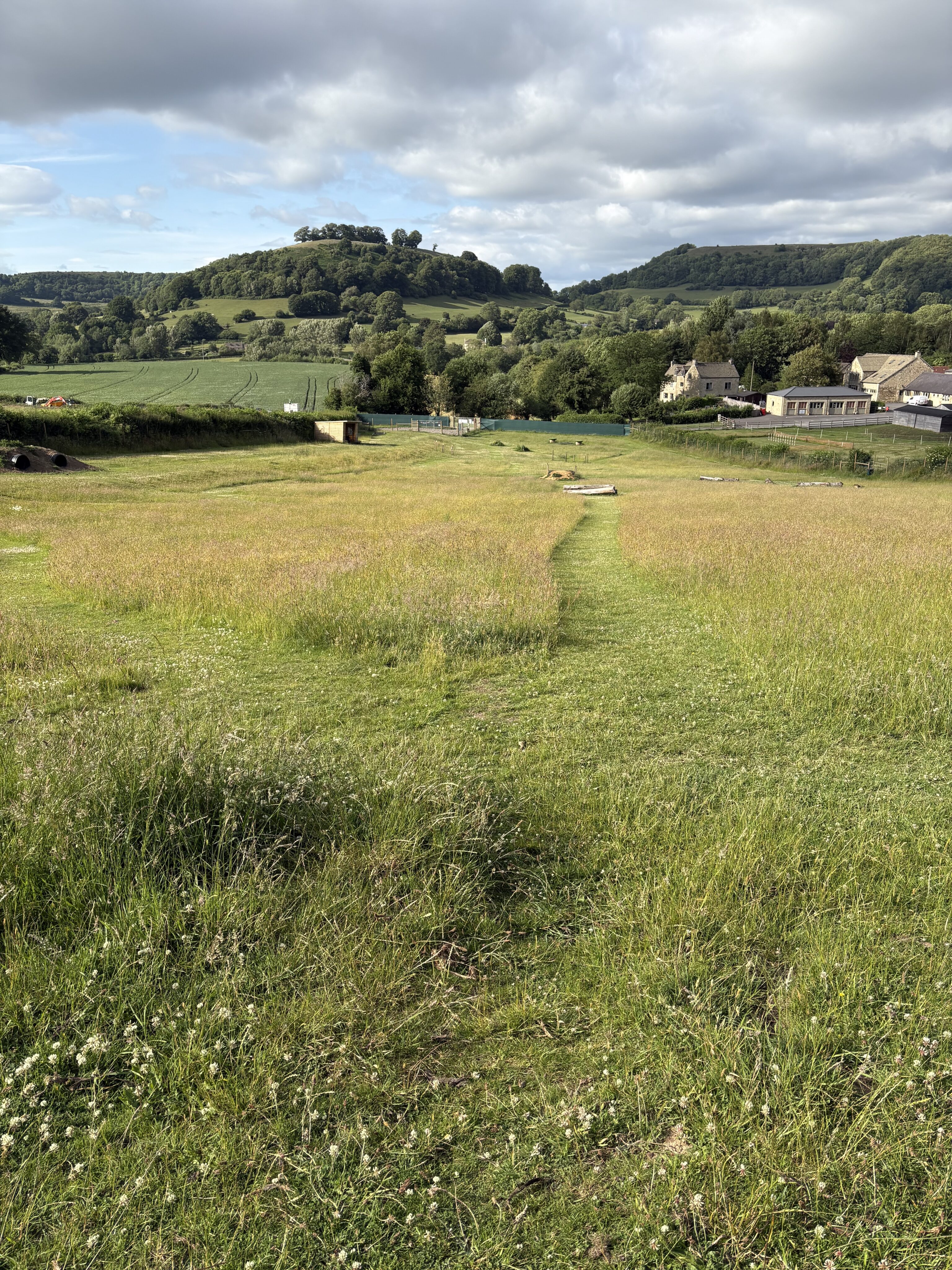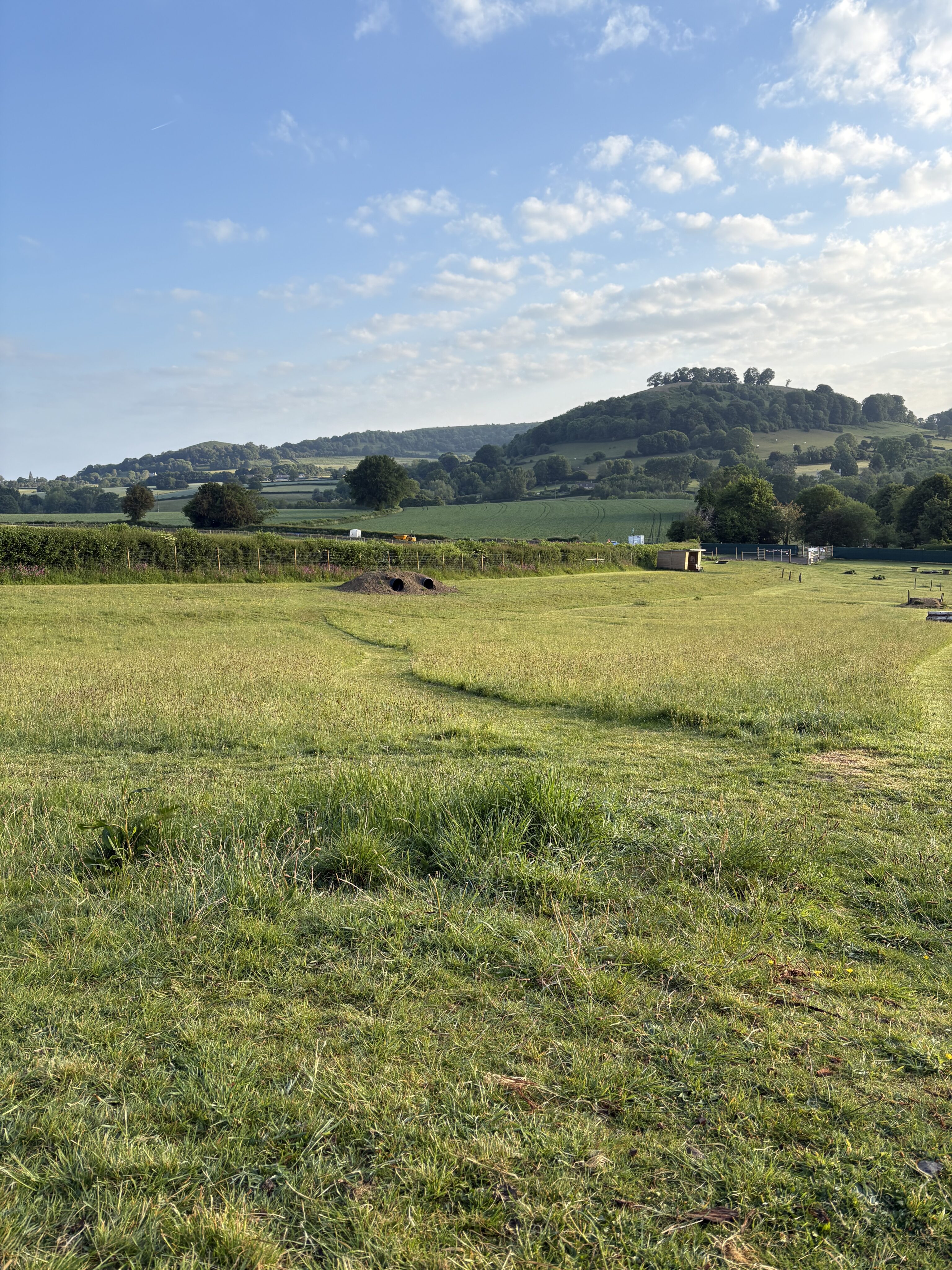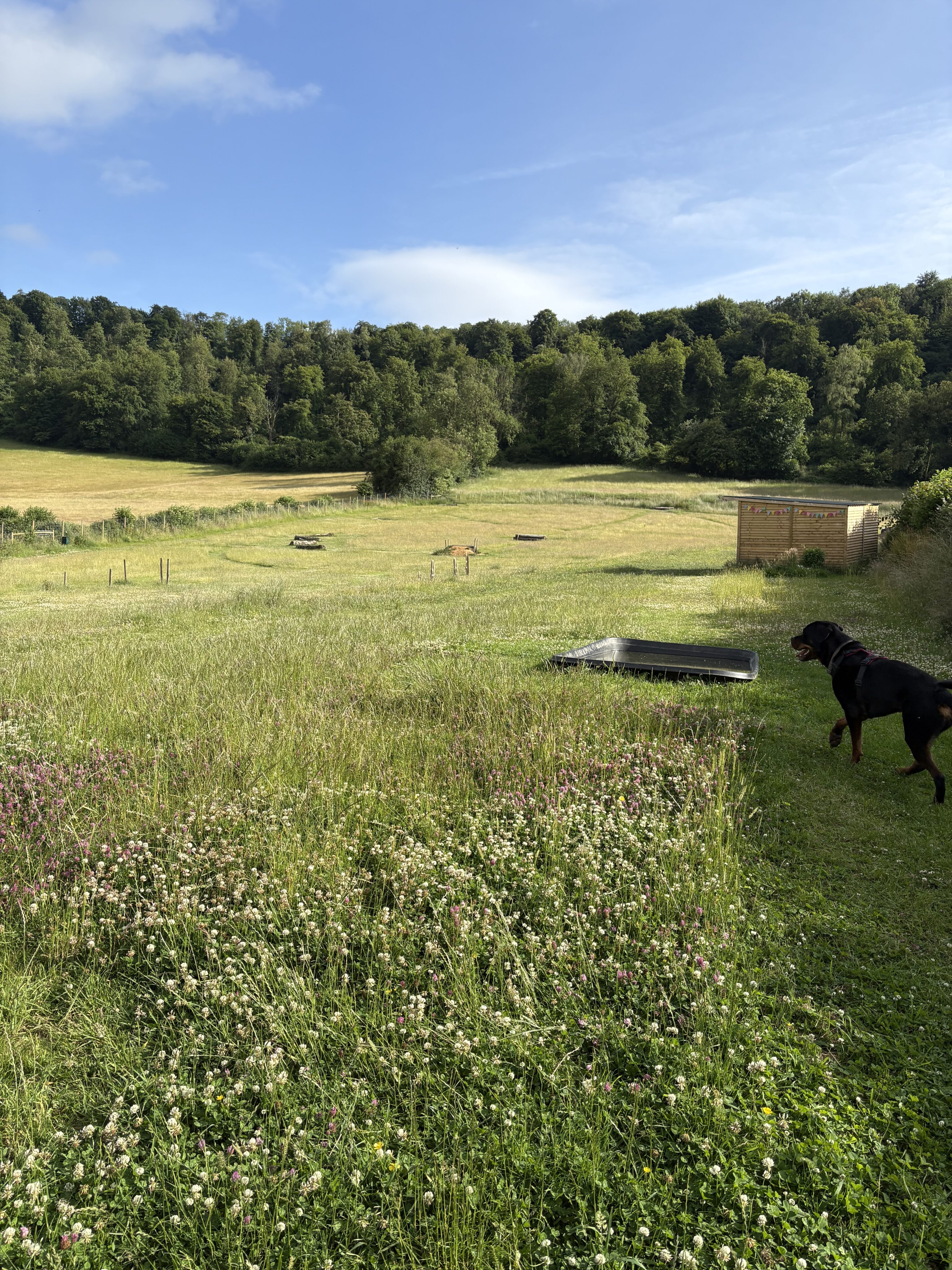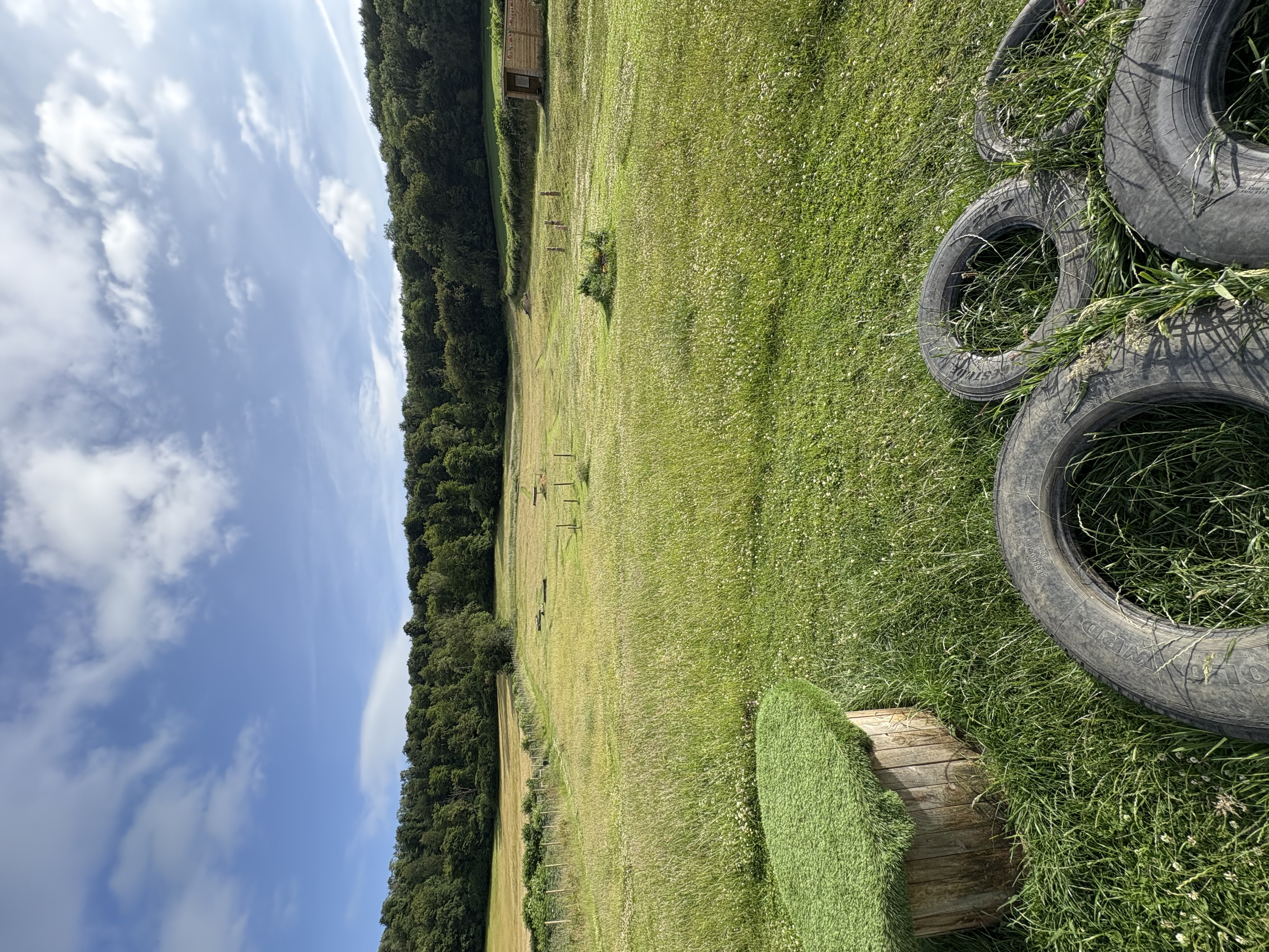We have water, natural logs, tyres, giant tunnels, sniffy areas and mown paths in the summer. We also have a hut for shade and shelter. Poo bins are dotted around the field, along with extra bags if you run out.