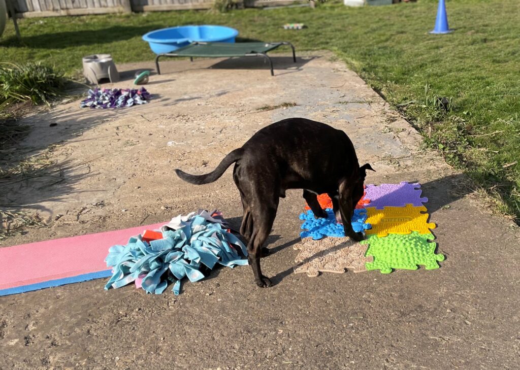 They provide opportunities for dogs to build confidence as they move around investigating different heights, different textures, different sounds, and scents. They are simple, low impact activities that can be rewarding, helping dogs to slow down, improve posture and release tension in the dog’s body as they engage the sensory part of their nervous system.