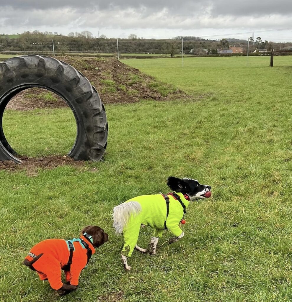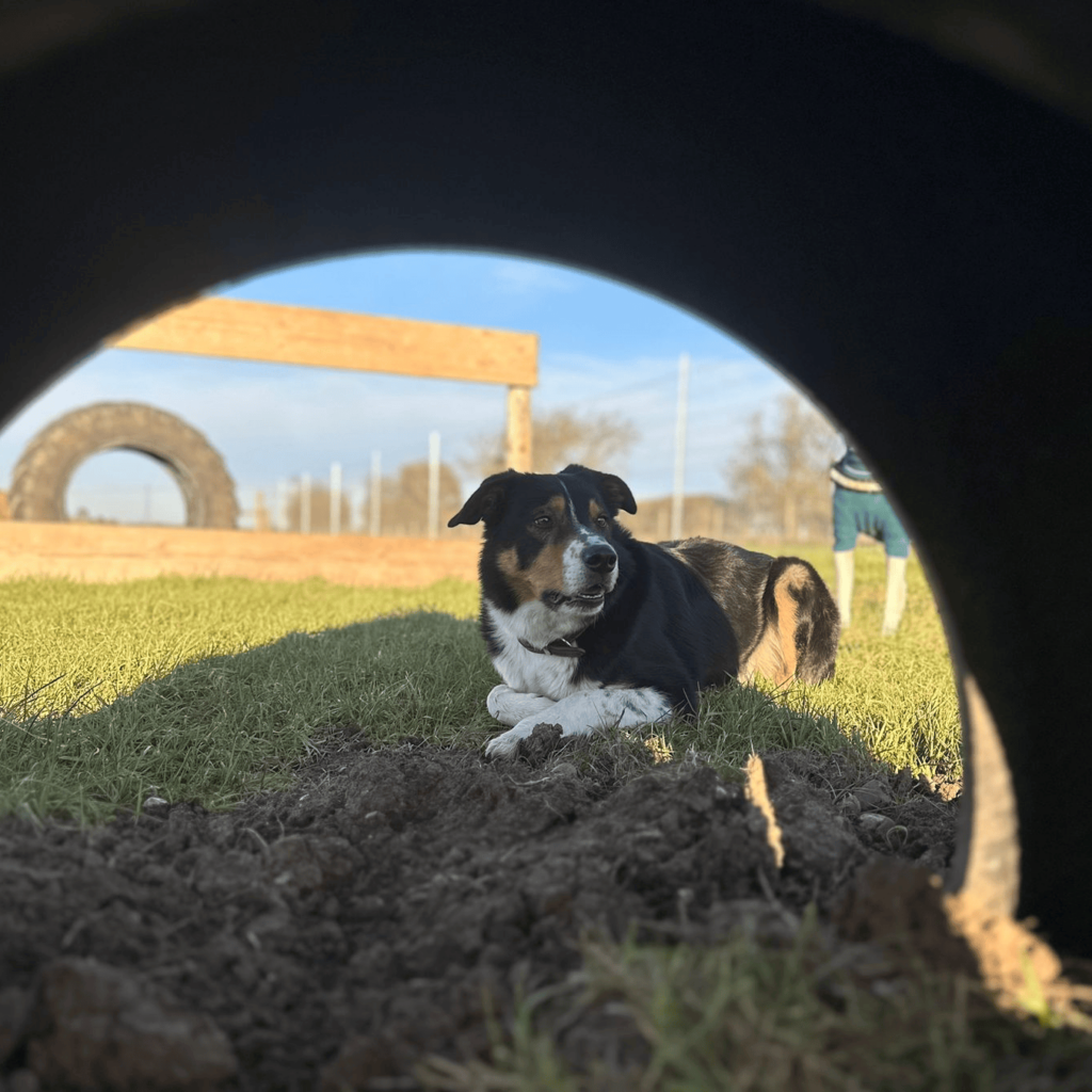 In our field, your dog can explore 2.5 acres of ground, tunnels, tractor tires, jumps, and weave poles. We have a 6-foot fence and dog netting around the bottom of the perimeter to prevent escapees from getting out.