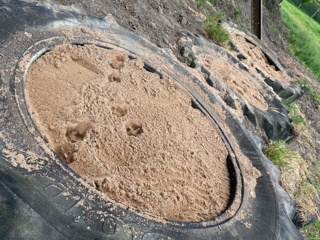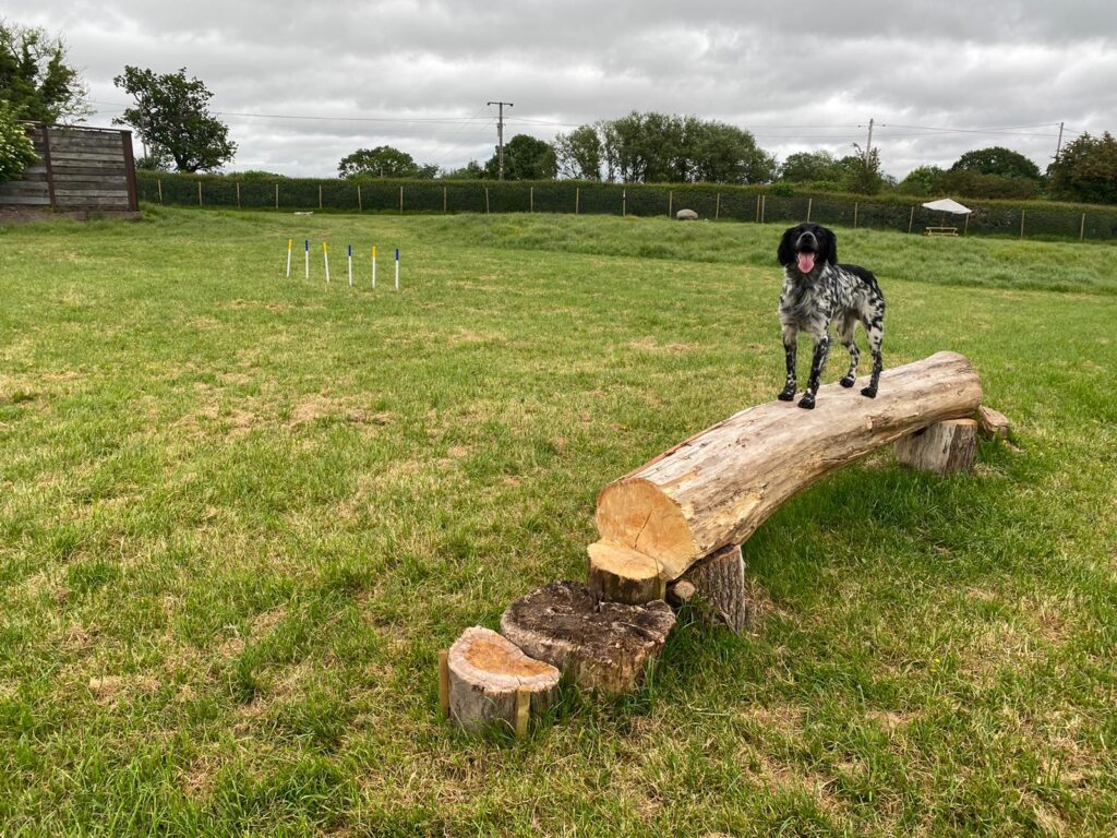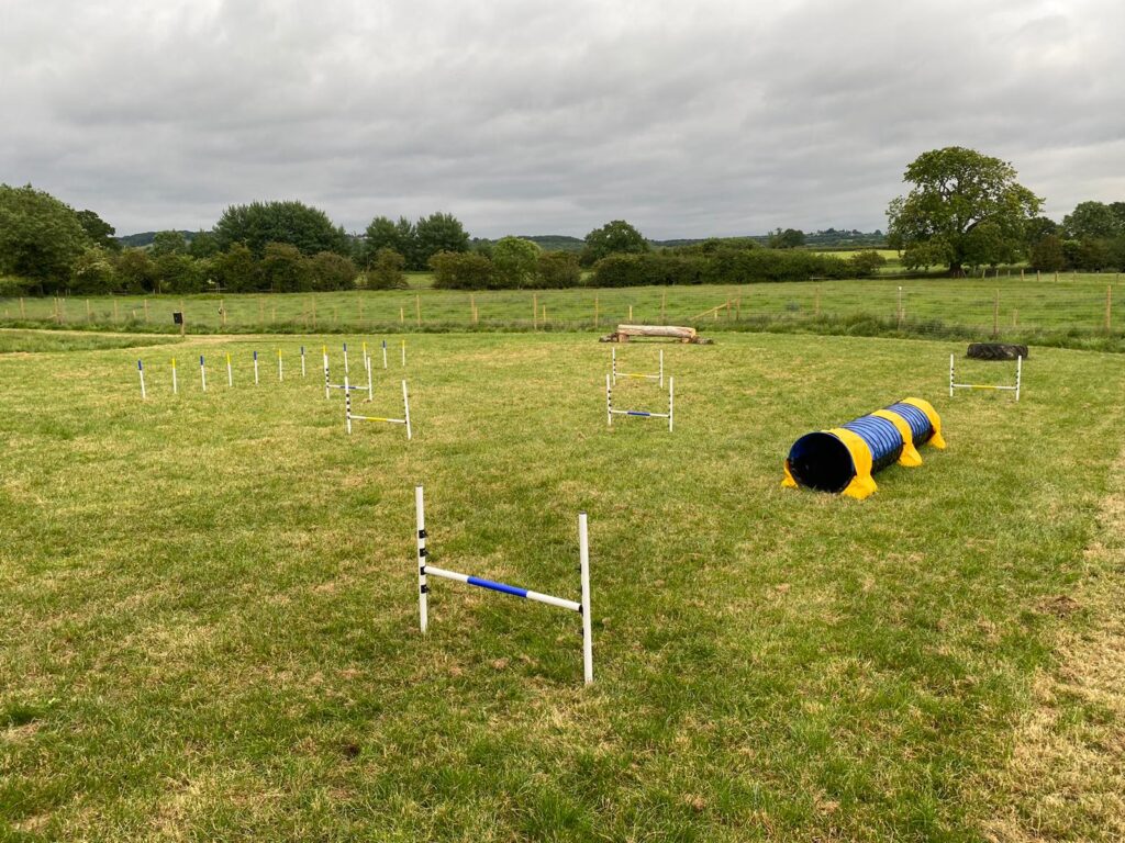There is a tyre digging pit, logs to walk across, a big boulder and basic agility jumps, tunnel and weave poles. We also have a toy “library” for added enrichment. All we ask is that everything is left in the field when you leave.