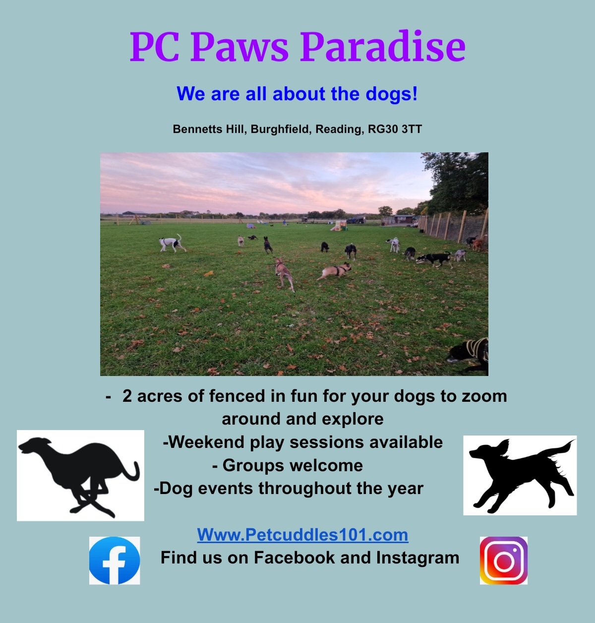 With 6ft plus high fences and gate it is very secure for your fur babies to run and play. For bookings please visit our website www.petcuddles101.com bookings are for 1hr slots, we also off play sessions, group bookings, breed meets and various dog events throughout the year.