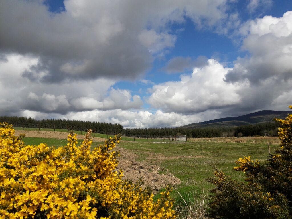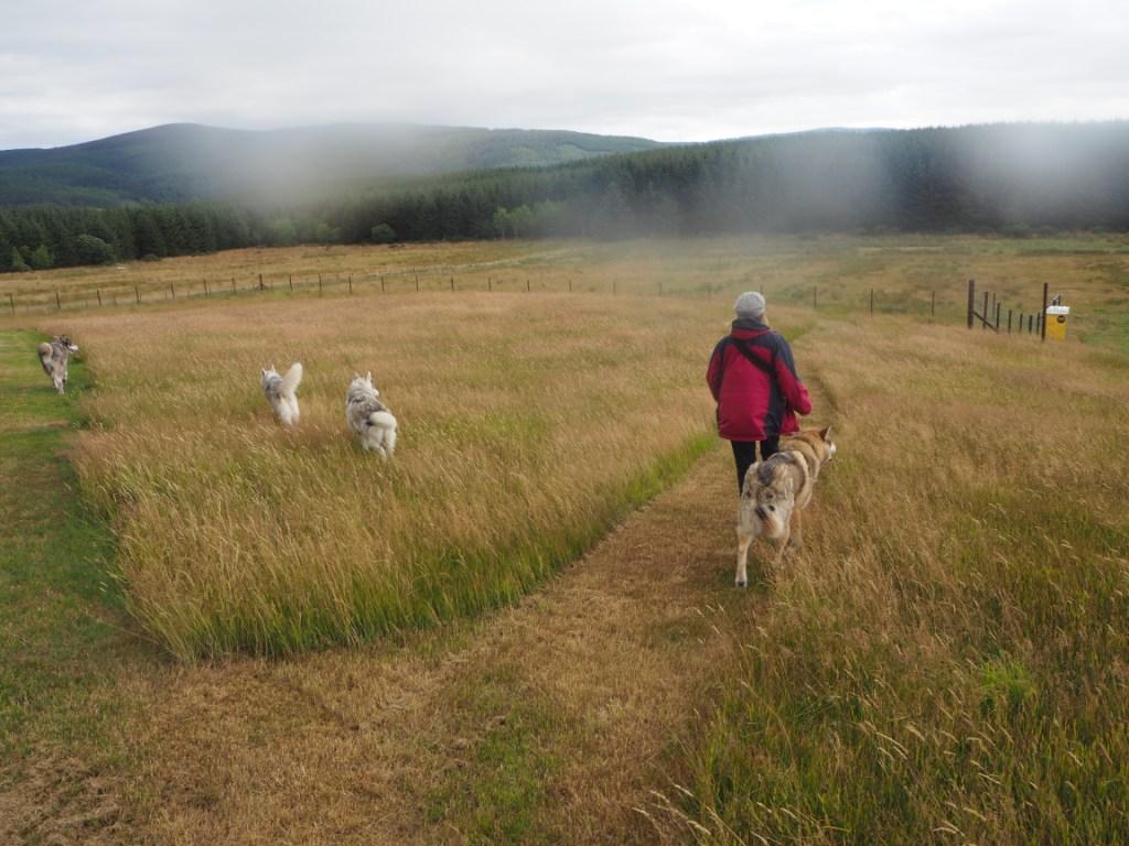 Our new secure dog walking field is located in the heart of Speyside and has stunning mountain views. Having kept sled dogs for the last 35 years we know how difficult it can be to find a place where dogs, that are difficult to let off lead for whatever reason, can run to their hearts content without getting into trouble with livestock or traffic. Whatever your reason, whether your dog is uncomfortable around strange dogs or people, a keen hunter, or you just want some private peaceful time to yourself with your dog, Rabbit Rock secure field is the ideal place. All dogs need the opportunity to run and explore smells in order to have a quality of life. It was the need to provide our own dogs with such a facility that led to the idea of setting up Rabbit Rock Field and we very much hope that your dogs will enjoy it as much as ours do.Rabbit Rock Field is approximately 6 acres enclosed by a brand new high quality 6 foot deer fence. In addition there is a 3 foot apron of ground wire on the inside in order to prevent any digging out and so that no gaps can open up at the base of the fence. This fencing is secure for the vast majority of dogs, but really little dogs would be able to get through the mesh as we do not want to exclude the smaller wildlife that abounds in the area. You will need to satisfy yourself that the fence is suitable for your particular dogs. Water is available inside the field near the gate but we don’t provide bowls for hygiene reasons. Currently, there is not really any shade so care needs to be taken in very hot weather, although a tree planting programme is planned for the future.The field is designed so that you can drive in and lock the gate before allowing your dogs out of the vehicle. There is a hard standing and turning area both inside the field and outside in order to allow for a smooth changeover. Slots are bookable on the hour and last 50 mins allowing a 10 minute changeover between users. Once you are in the field it is for your exclusive use and no-one else will be in it. In emergencies, the mobile phone signal is pretty good. Please call our mobile number which is displayed on the inside of the gate.
