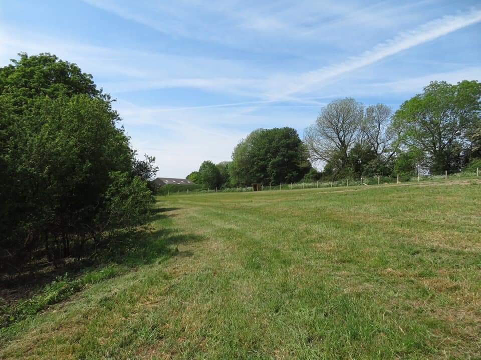 The field is appropriately 3 acres with a wooded area in the middle. We have a shelter, benches and a dog water tap.Â