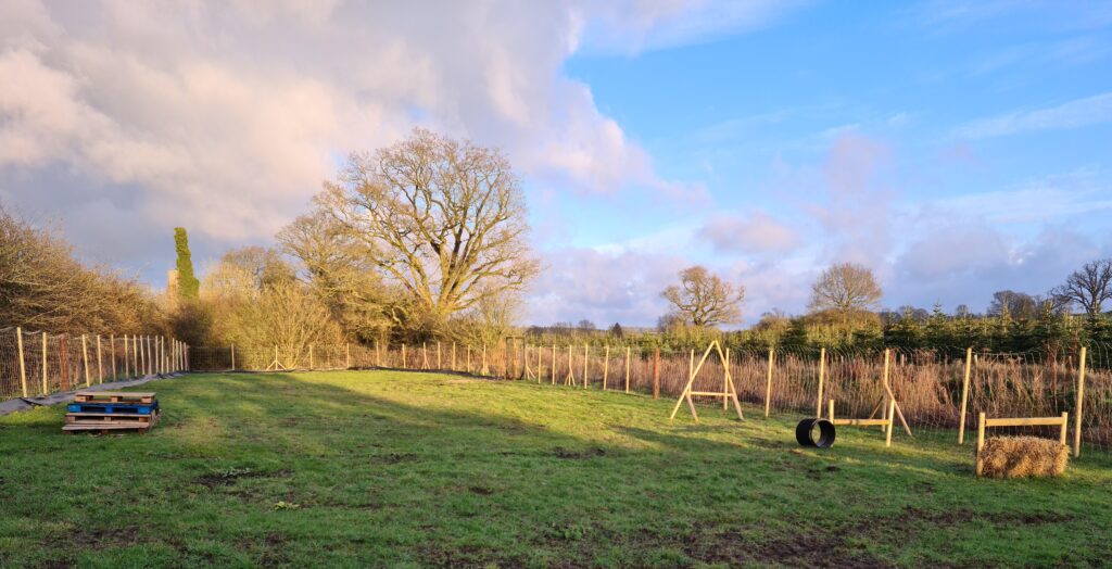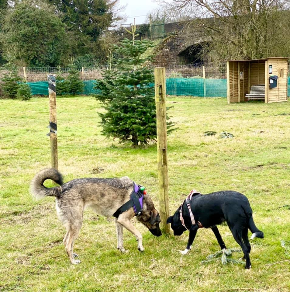 FACILITIES – The play areas are situated well off the village road and are accessed through a gated secure private car park. The Paddock includes three jumps, a small tube, tyres and a pallet ramp for play. For the humans, there is a shelter with table and chairs and a clear view down the field. Water is provided, as is a poo bin. And sanitiser is available. The Coppice is a mix of densely packed and more openly spaced mature Christmas trees for a sniffers heaven. There is a shelter with a bench seat, water, a small paddling pool and a poo bin. We visit both areas regularly to check the grounds, facilities and fencing, to top up the water, and to ensure that everything runs smoothly for when you arrive.