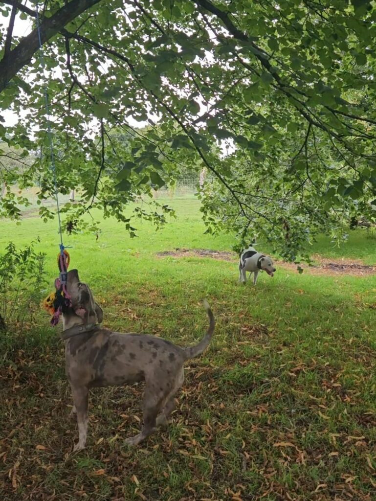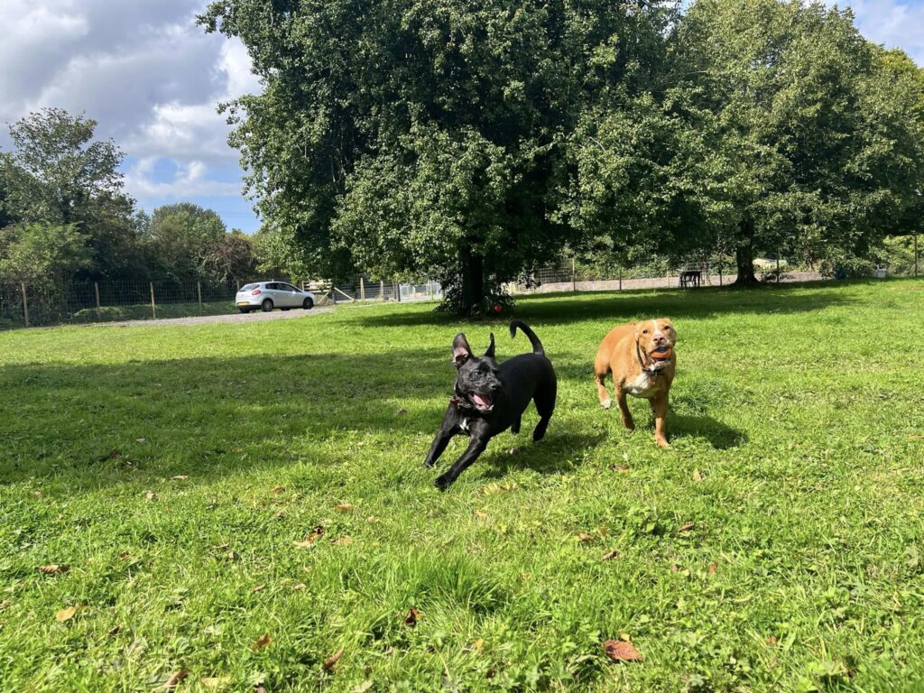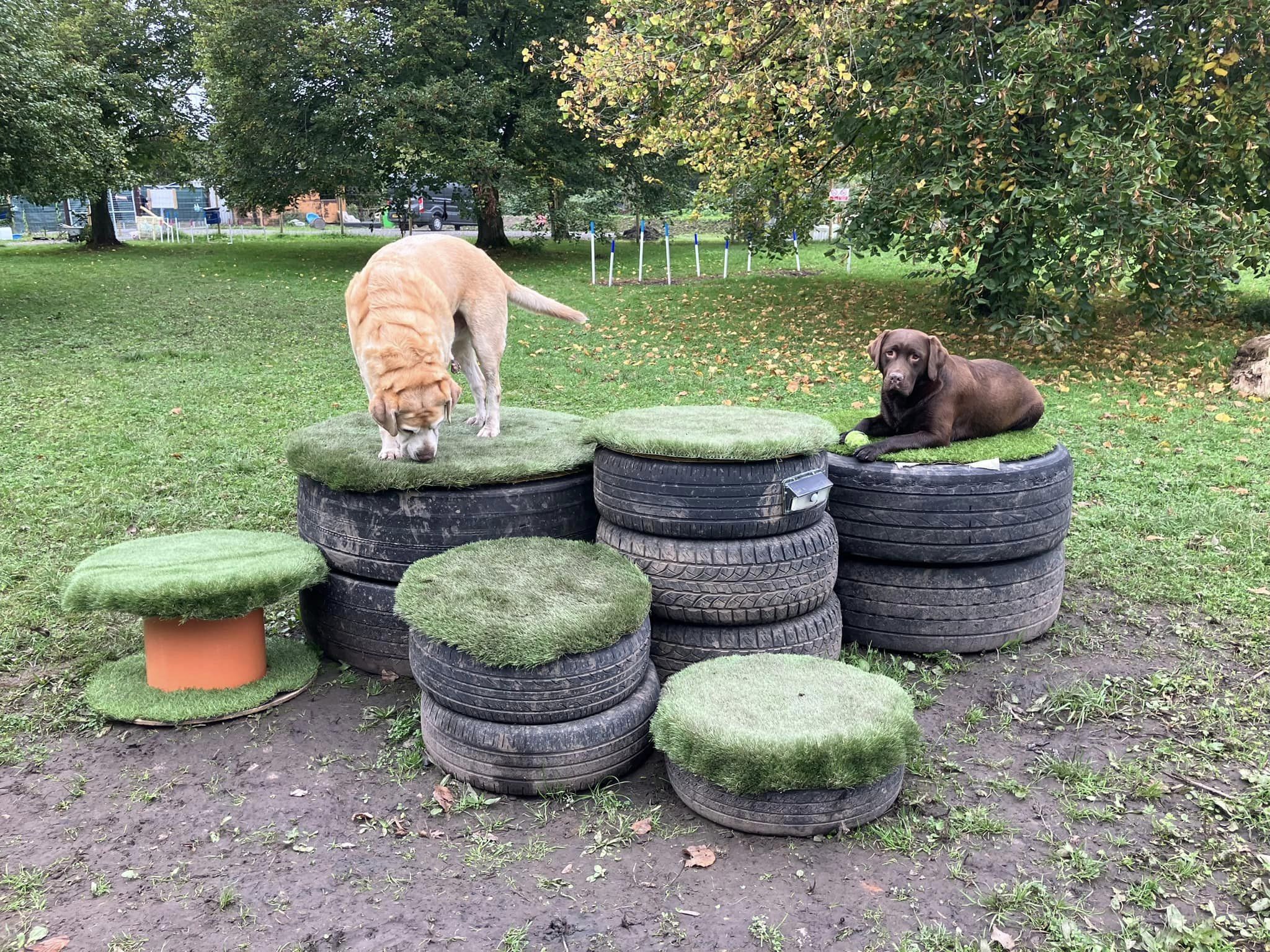 The Action Zone is just under 2 acres with an area of mature woodland and lots of space for your dogs to run and play. There is a low level agility style circuit consisting of hoopers, a tunnel, ramps, jumps, tyre mountain, cable reels and much more. A sandpit and paddling pool are also available.